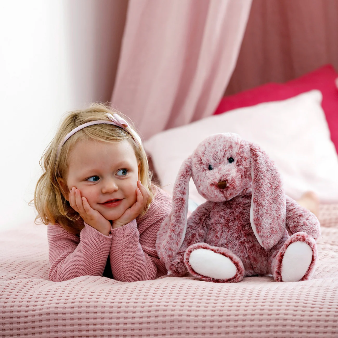 Denna söta lilla kanin har en mjuk päls i en vacker blandning av lingonrött och mjölkvitt. Med sina broderade detaljer, långa öron som är enkla att greppa och snälla ögon blir Lina snabbt en trygg och älskad vän.