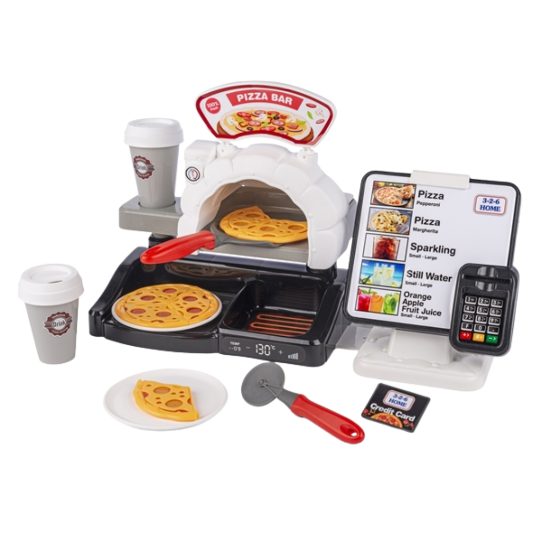 Pizzabar med ljud – den perfekta leksaken för små pizzabagare! Setet innehåller allt som behövs för att driva en egen liten pizzeria, komplett med pizzadelar, tillbehör och roliga ljudeffekter som gör leken extra verklig. Skapa, baka och servera fantasi-pizzor om och om igen – en rolig och kreativ lekstund för barn som älskar matlagning och rollspel.