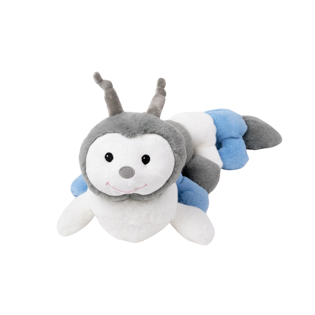 Denna gosiga tusenfoting i lugna pastellfärger av ljusgrått, ljusblå och vitt ger barnet en känsla av trygghet och komfort. Den är inte bara en mjuk lekkamrat utan fungerar också som ett spjälskydd i barnsängen, vilket ger extra säkerhet under vilostunder.